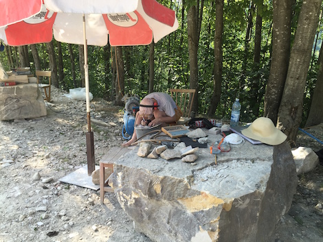 The students work with this stone, the Untersberg-marble. It is a limestone that is extracted from the quarry and has been used for stone sculptures since antiquity. “Everything starts with the material, you have take time to find the right stone to work with” tells me Peter Niedertscheider. Only on Sundays the class is alone in the quarry. Then the workers, who extract the stone leave the site. So, only on Sundays the class can stroll around in all parts of the quarry to look out for stones to work with. “Choosing the stones has to be in the morning otherwise one doesn’t see flaws”.