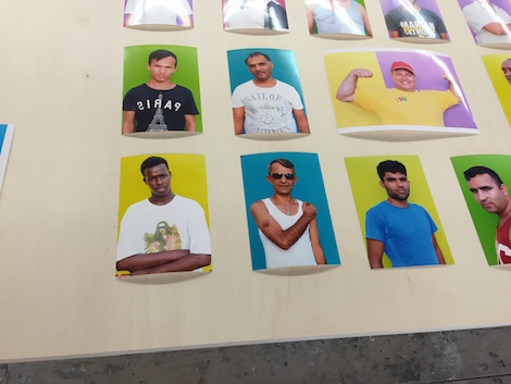 This care for the legacy of gazes was also a concern in the exhibition of Tobias Zielony’s class. Silvia Scheid’s photo series Street Studio consists of minimalist portraits of refugees in Salzburg. In contrast to press photos that show refugees in their miserable shelters and create icons of suffering, Scheid’s photos avoid any background. She brought movable colourful background panels to the shootings. Erasing and simplifying the background allows to see her protagonists beyond their social role of refugees. Yet, oftentimes a little detail from the actual background remains uncovered. This renders visible the process of covering, too.