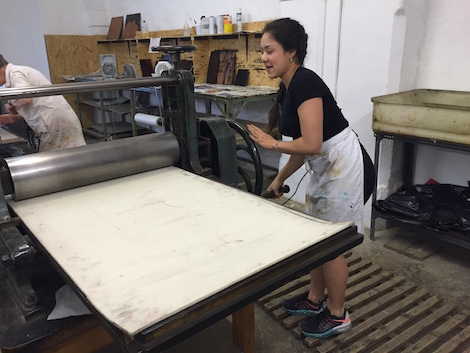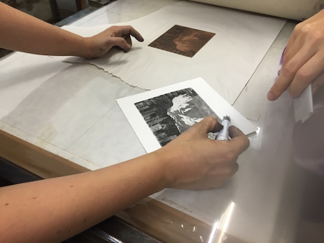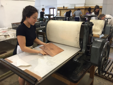 Analogue processes have also a different temporal structure. Making a print is not a workflow as in digital media. Oftentimes you have to wait for a material to dry or for a printing plate to heat up. These breaks bring forth a very different kind of working environment. When you visit Elisabeth Schmirl’s class you see a buzz of activities, each person working in its very individual rhythm. Many of the activities like applying colour are not cognitively demanding. One student compares them to short moments of meditation that are good contrast to the conceptual work involved in creating the plates.