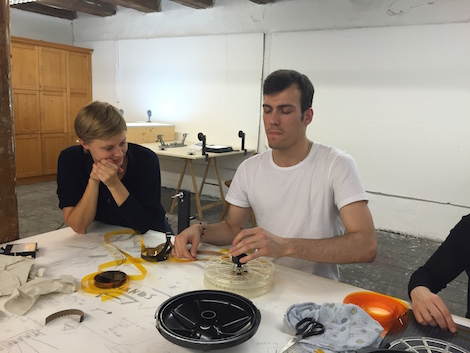 The first thing you notice is that the work in both classes is highly tactile. While digital editing and layout software requires mainly your eyes, for analogue work you have to engage all your senses. On this photo you see one of the students of Cinéma Copains practicing to reel film. His eyes are closed to simulate the lack of sight in the darkroom. His fingers have to rehearse the process several times and he has to learn to recognize the sound when the film is in the right position.