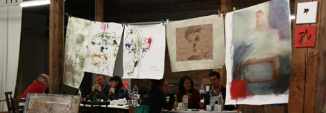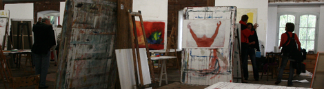 To my surprise, upon entering the room that was still arrangedin individual working spaces, the eye was met by a labyrinth of colourful, more or less wildly abstract paintings that hung, stood and lay wherever one looked. In-midst were the students, cheerfully sharing a victory meal together before packing up their works. They all seemed to have had a great time and received a good deal of inspiration. As one student said, "He [Hubert Scheibl] made us watch films and take scenes of them to work from, which was a very new approach for me."