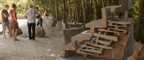 Where last year I had made my way there through pouring rain and gladly accepted the tea offered after a tour of the students works, this years open day at the quarry, held by the Stonemasonry class, could not have been more different. People nonchalantly strolling between the stoneworks, having them explained by their creators or touching the works by themselves, thenheading up the gravel path for a sip and a bite at the big marble table, joining the others already sitting there lazily in the shade.