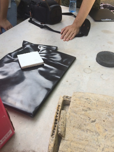 Andrea Lolis sculpts marble to create polymeric foam, black plastic bags, or say, a gift as he has been carving today. Because of its looks one expects the material to be really light. The heaviness of marble in contrast creates confusion. For instance, Nina Kerschbaumer couldn't be sure if the leftover plastic nearby is also marble or not.