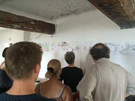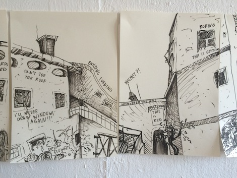 I visited Katchor’s class today. The artists explained why they chose that spot to draw and described their emotions and observations with text in their comics. Here are some notes: