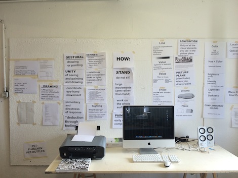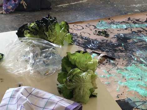 Pictures on flesh… Tattoos – like poetry or, say, painting – are gestures of life… Before starting to write, I usually have a 30 minutes exercise that I let go of words – Jennifer Allen taught that technique two years ago in her writing class at the Academy. It’s reminiscent of a gestural painting. This morning, I’ve learned that Irina Nakhova’s class start with such gestures as well. In a similar fashion, Melissa Gordon and the students were marking with various objects – just putting traces on a huge paper laid on the floor.