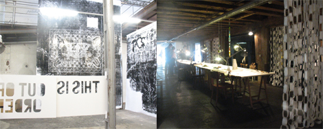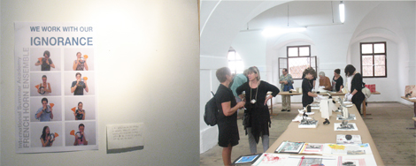 It is the rain that slowed all of yesterday. The plans changed but in the end it all worked out. The doors to the working spaces opened up not only to each other but also for the public. Some more than others worked with the space they were given. Most seemed to prefer to leave the space in the sense of an open artist studio, leaving the brushes and canvases as well as work that was still in process around. Some paid more attention to the surroundings and created little universes that showed the amount of work that was done in the past three weeks. I was more than impressed with the works of the printmaking group organized by Leya Mira Brander, the video class by Felix Gmelin as well as the works of the class organized by Thomas Kilpper. It was incredible what they managed to do in this amount of time. Now while I am writing I am thinking that it is a shame that the works are not on show a little bit longer. Maybe, who knows, at one point a little collection of the works could be organized as a little museum or a permanent collection of the works produced here.