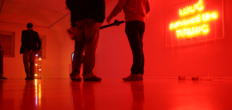 „Death of the Monument“ is not only the title of the exhibition from Marko Lulic at Galerie im Traklhaus which was opened yesterday evening. It is also the title of a huge sculpture which is situated in the courtyard, consisting of exactly these words in a typeface that reminds us of cowboy boots and western movies. Marko Lulic is a sculptor, his work deals mainly with two themes. First: what is a sculpture and more precisely what is a monument? And second what is modernism and how has it appeared in sculpture, city planning and architecture. When he researched about 10 years ago the modernist Yugoslavian monuments reminding of the partisans in World War second these two concerns merged. What he did was, he rebuilt these monuments as small models, as bricollages. These monuments as all monuments especially war memorials expressed how a society constitutes itself in constructing a specific view on ist own history. Another work in the exhibition is the video „Space Girl Dancer 2009“. We see dancers re-enacting a choreography by Rachel Welsh within the sculpure garden of Erich Hauser in Rottweil / Germany, a garden with slightly old-fashioned modernistic sculptures. This choreography was originally shown in a TV special called „Rachel!“ 1970 done at a public space in Mexico as public art project for the olympic games in 1968. The impression of the choreography was something between ethno, extra terrestrial and science fiction. Lulic transfers this modernistic combination of dance and sculpture to Germany, invents new costumes and uses a newly composed music by Mario Neugebauer. "It's interesting that the dancers as well as the video becomes a sculpture. The video is cut in a way that the sculptures start to dance as well." (opening words of Hildegund Amanshauser)