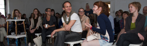 Yesterday saw a radical break with standard lunch talk practise as Mladen Stilinovic not only deprived the audience of images of his work, but didn't go into his artistic curriculum at all, instead focussing on his pursuit of language, a central theme in his works. Even a small performance was in store as his students, scattered throughout the room, proclaimed some of the slogans he had coined throughout the years, taking many of them from people he heard talking on the street.