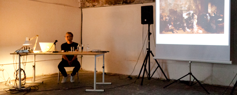 He discussed the role the studio has in terms of its relevance to his own work, and explained his own working spaces. His studio is a "space for thinking", it is a place where he can show his work to visitors, but also remains an intensely private space for him. His studio comprises three rooms: a "clean white room", which is a space for "hands-on" work, and a place "to think"; a "messy" office and storage room; and a computer room, a virtual studio which, he confessed, has changed his ways of working. But while the images illustrated the physical aspects of his studio, his final insistence that a studio is a space where desires and "projections concerning other plans" are made, gave us the clearest insight into his methods.