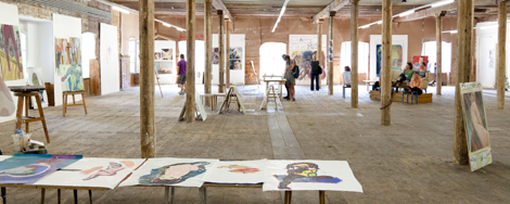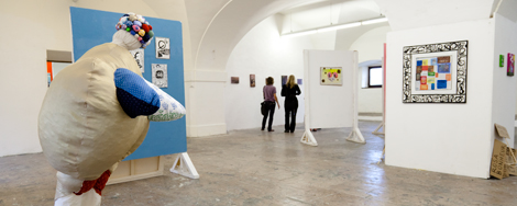 In each location the results of the students’ work was displayed. The atmosphere was one of a sense of satisfaction tinged with exhaustion. Matthew Wilson, a student on Manfred Pernice’s sculpture course, summed up the feelings of many: however long a work may appear to have taken, it actually took twice as long. The variety of work across the courses was remarkable, and even within courses students challenged the boundaries of their subject and media. It is impossible, and would be unfair, to attempt to identify favourites, although some works do stick in the mind: the speculative construction of students on Christopher Roth’s architecture course, who created an account of what may have happened to one of their classmates who disappeared halfway through; the drawings of the prolific Michelle Cioccoloni; and Ulrich Jordis’s Roy Lichtenstein inspired painting, which had my thirteen month-old daughter quite literally dancing with excitement (possibly due to the dog)!